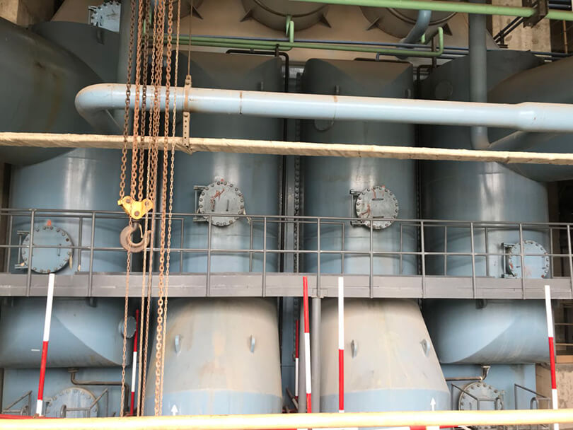 工程简介:巴基斯坦Nandipur 425/525MW CCPP,其凝汽器长期使用高硬度高碱度地下水运行,换热管内壁结垢严重,平均厚度达到1.0毫米左右,严重影响机组出力和效率。针对现场严重及复杂的凝汽器结垢情况,我公司最终选用了类似“靶向治疗”的中国专利清洗技术。